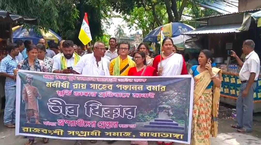 রায় সাহেব ঠাকুর পঞ্চানন বর্মার মূর্তি ভাঙার প্রতিবাদে ধিক্কার মিছিল রাজবংশী ঐক্য মঞ্চের